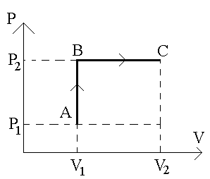 Работа, совершаемая газом, графически определяется площадью под кривой ABC в системе координат PV, и складывается из работ на участках AB и BC. В нашем случае, работа на участке AB не производится, следовательно, вся работа над газом будет определяться работой на участке изобарического процесса BC