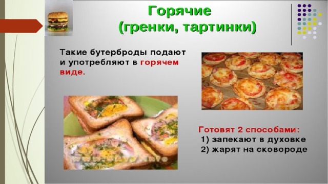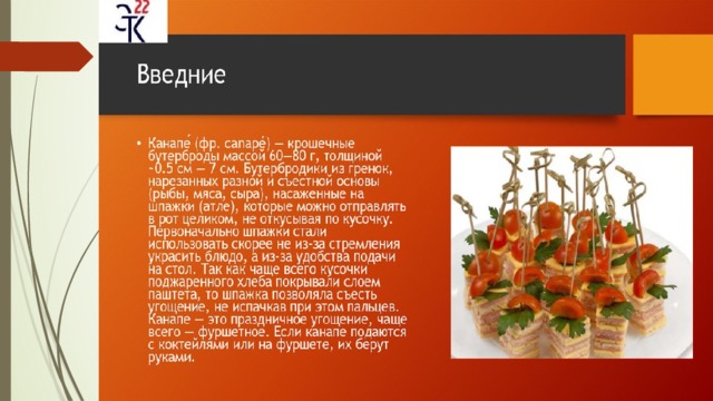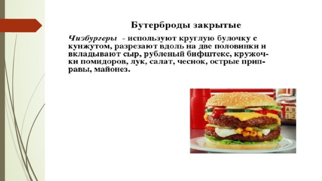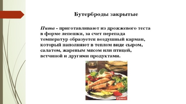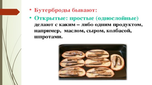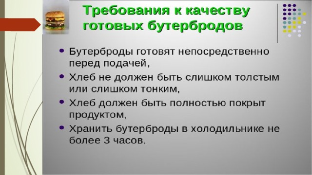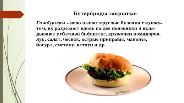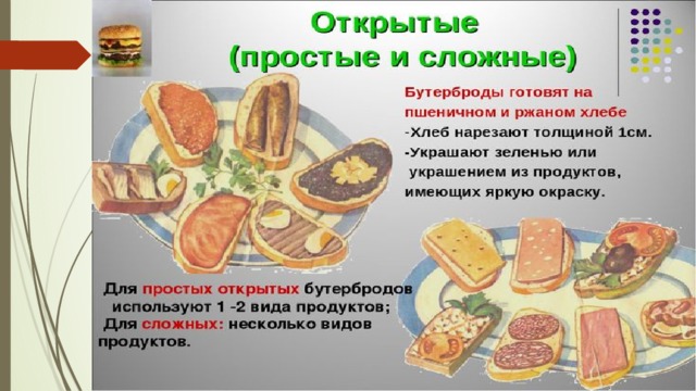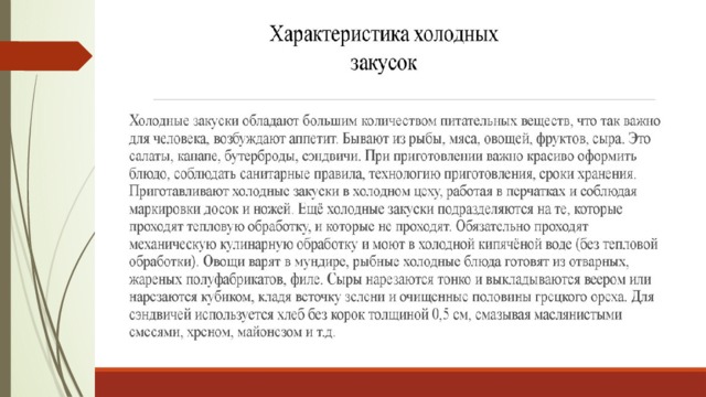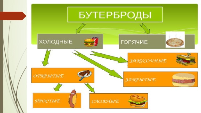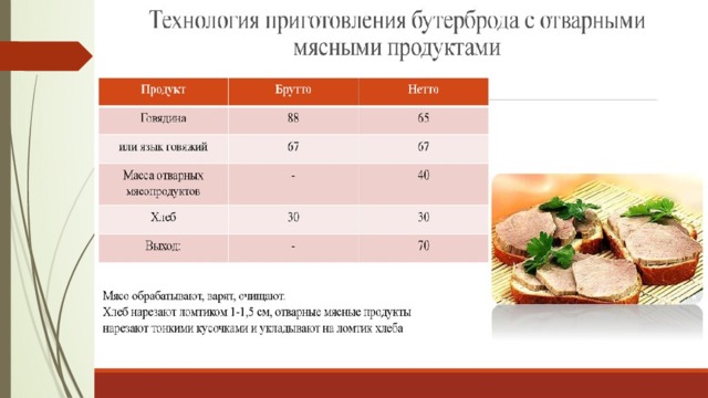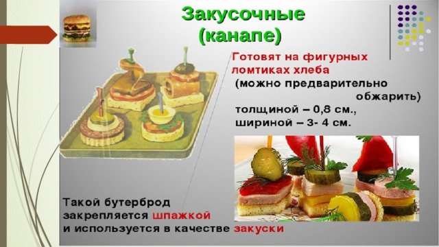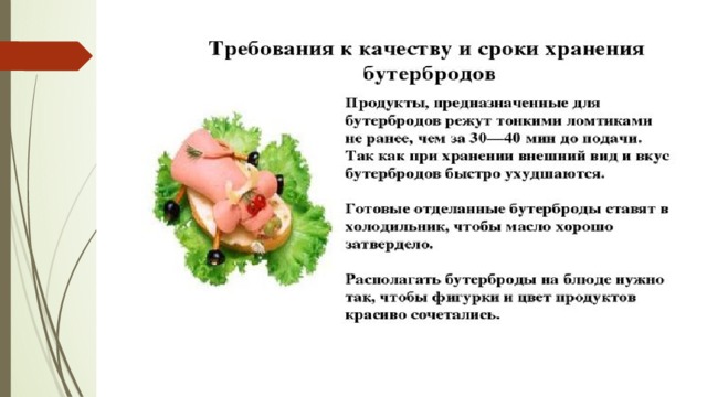 Тема урока: Делает заготовки для закусок, бутербродов, соблюдая виды и размеры нарезки. Цель урока: Изучить технологию приготовления закусок и бутербродов.