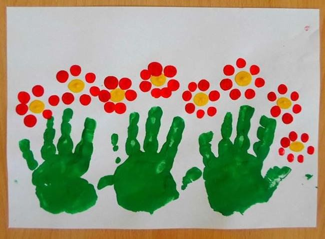 Старший возраст: Воспитатель показывает различные варианты рисования бутона ладошкой (не только округлого, но и вытянутого), объясняет, как можно разнообразить стебель и листья.