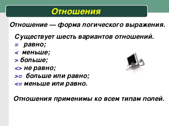 больше; не равно; = больше или равно; меньше или равно. Отношения применимы ко всем типам полей. " width="640"