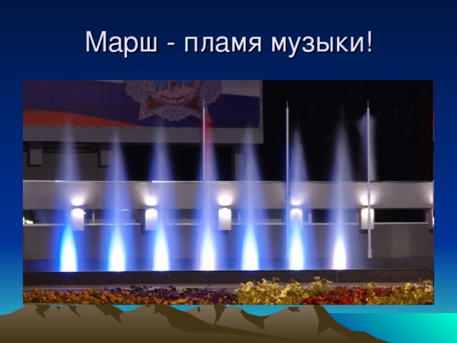 Марш — (итал. marcia, фр. marche, от marcher — идти) — род музыки, сопровождающей или рисующей стройные размеренные движения людей, преимущественно войска. Одной из важных функций военных маршей вплоть до конца XIX века являлась синхронизация шага наступающих колонн. Марш пишется в четыре четверти или 2/4 в двухколенном или коленном складе, с трио. Ритм должен быть ясный, простой и энергичного характера. В зависимости от скорости движения, марш получает разные названия.