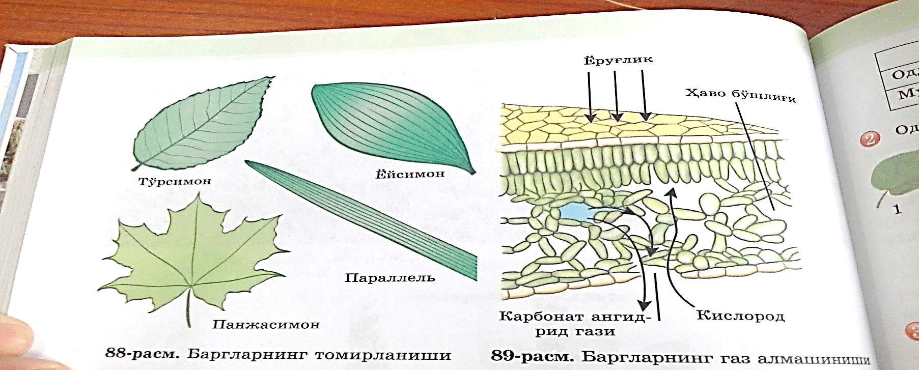 | Тилни бойитиш | -барг, пластинка, оддий, мураккаб, томирланиш , сув буғлатиш, бандли, бандсиз, мезофил, хаво бўшлиқлари. | |||||||||||||||||||||||||||||