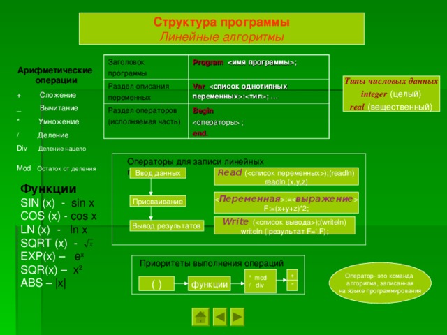 ; Раздел описания переменных Раздел операторов (исполняемая часть) Var список однотипных переменных : тип ; … Begin ; end . Арифметические операции + Сложение _ Вычитание * Умножение / Деление Div Деление нацело Mod Остаток от деления Типы числовых данных integer (целый) real (вещественный) Операторы для записи линейных программ Read () ;( readln) Ввод данных readln (x,y,z) Функции SIN (x) - sin x COS (x) - cos x LN (x) - ln x SQRT (x) - EXP(x) – e x SQR(x) – x 2 ABS – |x| Переменная := выражение F : =(x+y+z)*2 ; Присваивание ры Write () ;( writeln) writeln (‘ результат F=‘,F) ; Вывод результатов Приоритеты выполнения операций Оператор- это команда алгоритма, записанная на языке программирования * mod / div + - функции ( ) " width="640"