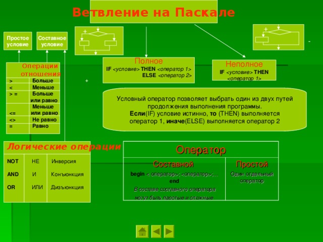 THEN оператор 1 ELSE оператор 2 Неполное IF условие THEN оператор 1 Операции отношения Больше Меньше = Больше или равно Меньше или равно Не равно = Равно + Условный оператор позволяет выбрать один из двух путей продолжения выполнения программы. Если ( IF ) условие истинно, то ( THEN ) выполняется оператор 1, иначе ( ELSE ) выполняется оператор 2 Логические операции NOT НЕ Инверсия AND И Конъюнкция OR ИЛИ Дизъюнкция Оператор Составной begin ; ;… end В составе составного оператора могут быть простые и сложные Простой Один отдельный оператор " width="640"