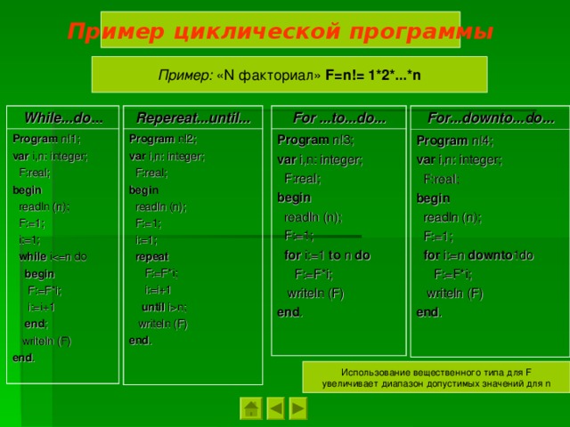 n ; writeln (F) end . Program n! 3; var i , n : integer ; F : real ; begin readln (n) ; F := 1 ; for i :=1 to n do F := F * i ; writeln (F) end . Program n! 4; var i , n : integer ; F : real ; begin readln (n) ; F := 1 ; for i := n downto 1do F := F * i ; writeln (F) end . Использование вещественного типа для F увеличивает диапазон допустимых значений для n " width="640"