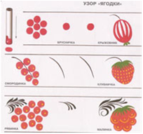 - Какие ягодки художники используют в хохломской росписи? - Хохломские художники называют ягоды ласково, и никогда один и тот же мастер не напишет их одинаково. - Как “оживим” наш орнамент? - Ягоды смородины, рябины рисуют тычком или ляпушкой (кусочек овечьей шерсти, обмотанный вокруг палочки). Но чтобы стать мастером, мало обладать навыками мастерства, нужно вложить всю свою душу в свое изделие. Поэтому они получались такими красивыми. | - Красный, черный, зеленый, желтый, золотистый. - Красным, чёрным. - Осочки, травинки, кустики, капельки и др. Дети выполняют за учителем.