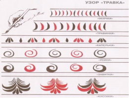 Цель: правильность выполнения задания | - Назовите основные цвета в росписи? - Сегодня мы будем рисовать отдельные элементы “травного” узора хохломской росписи. - Каким цветом написана травка? Учитель показывает на доске, объясняет технику работы над выполнением отдельных элементов хохломского узора. - Вспомните основные элементы “травной” росписи? Осочки - самый простой элемент. Он выполняется легким движением кончика кисточки сверху вниз. Травинки - это мазки с небольшим плавным утолщением. Капельки выполняют, прикладывая кисть к изделию. Усики изображают непрерывной линией одинаковой толщины, закрученной в спираль. Завитки выполняют, как и усики, только с легким нажимом в середине элемента. - Как мы нарисуем ягодки?
