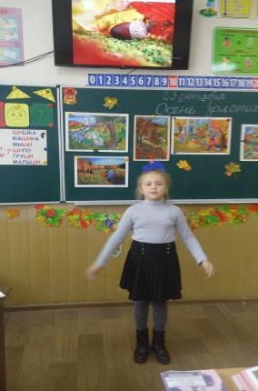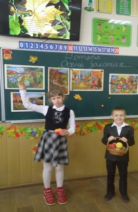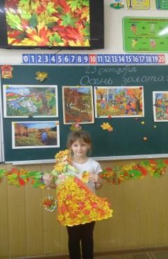 Оформление. На доске рисунки и плакаты с изображениями осенних пейзажей, осенние листья и плакат девушки-осени; презентация «Золотая осень».