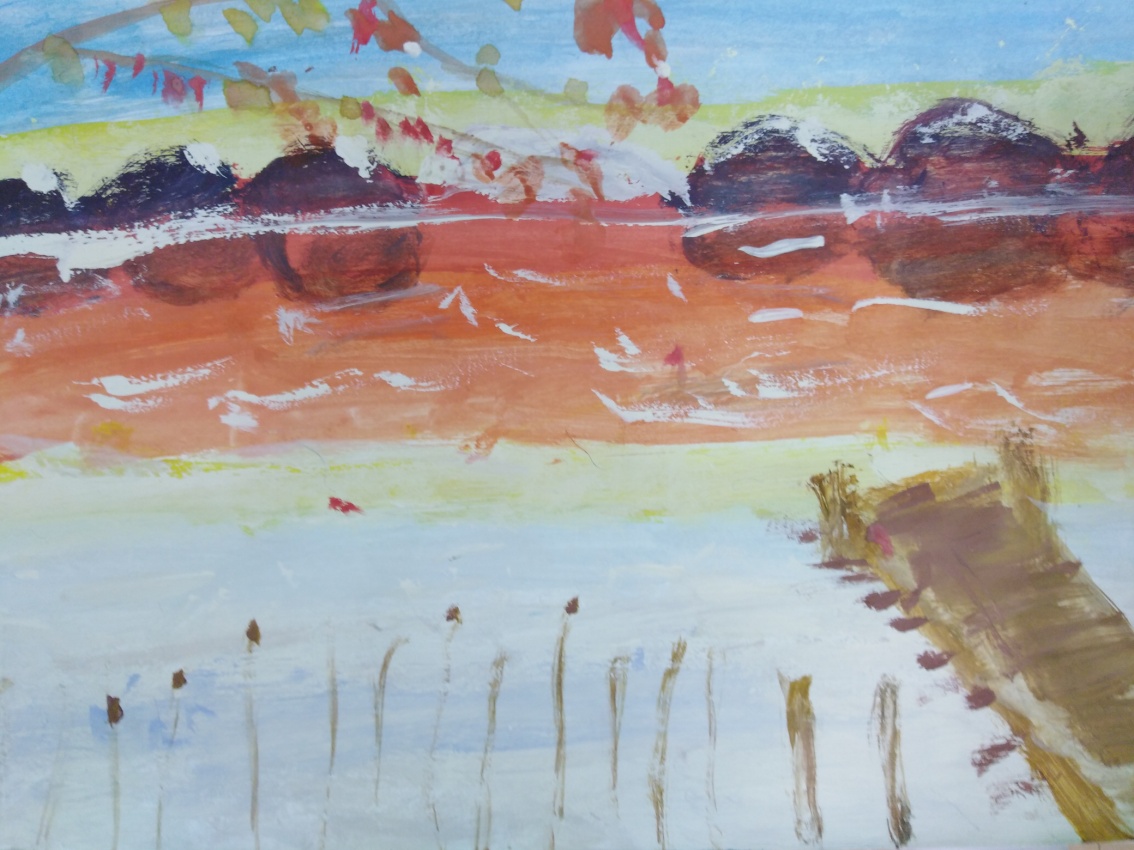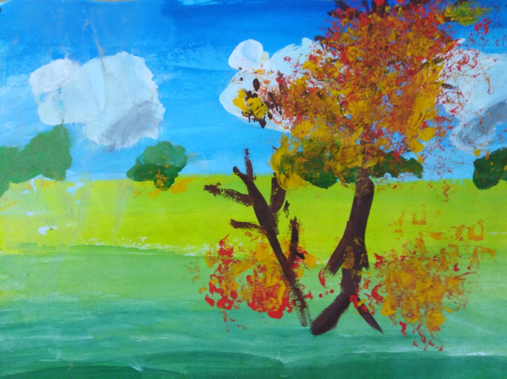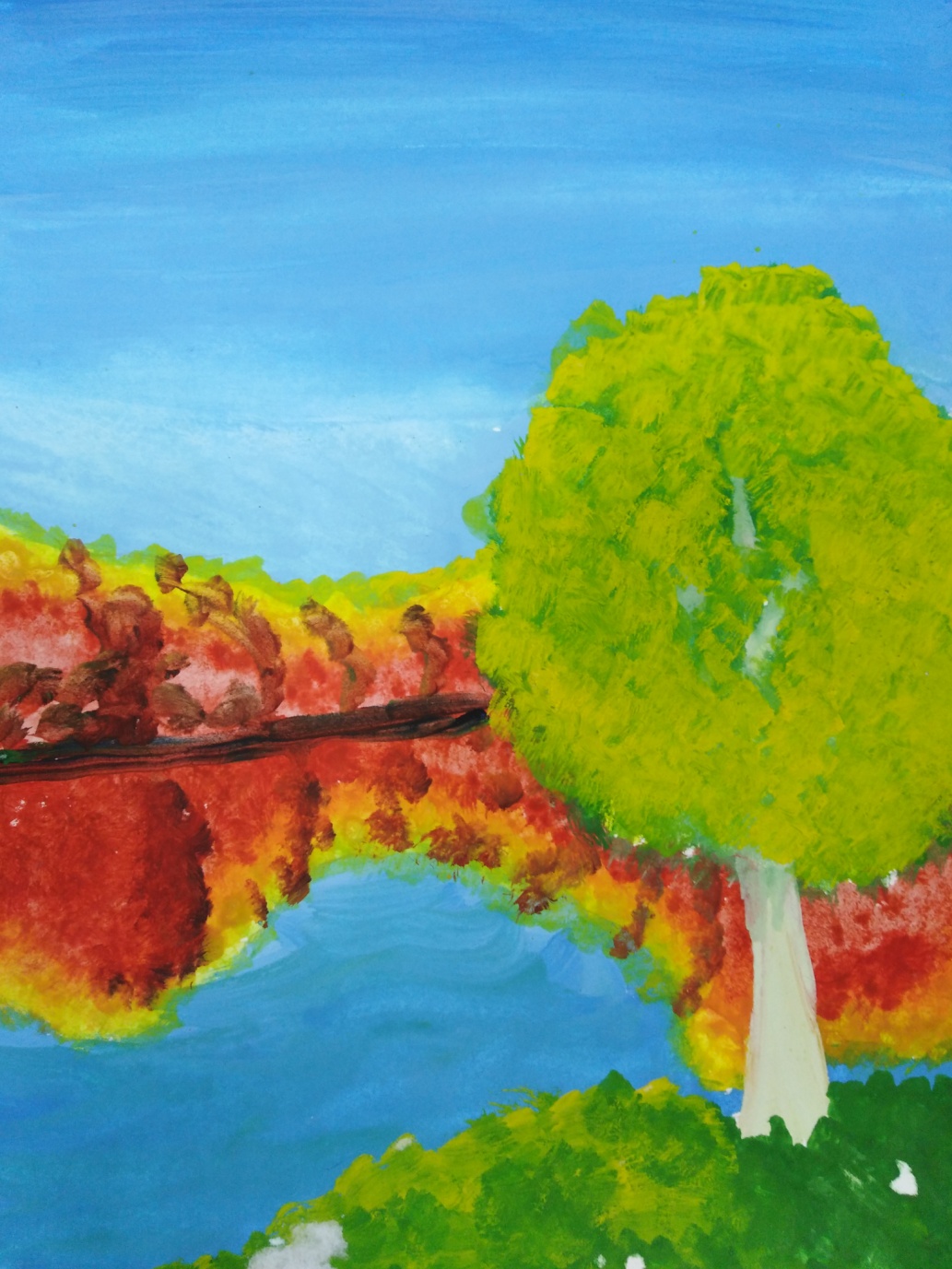 (Обучающийся: Бледно- голубое небо, зеленая с цветом охры трава, желтые, бордовые, оранжевее оттенки на поверхности деревьев. Сизый цвет воды).