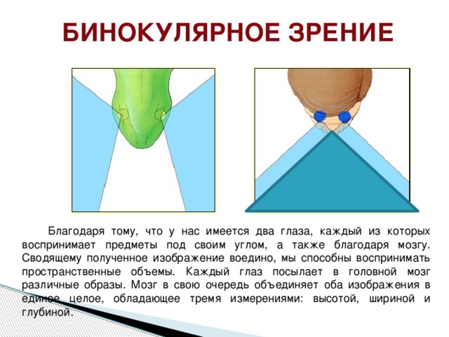 Благодаря тому, что у нас имеется два глаза, каждый из которых воспринимает предметы под своим углом, а также благодаря мозгу. Сводящему полученное изображение воедино, мы способны воспринимать пространственные объемы. Каждый глаз посылает в головной мозг различные образы. Мозг в свою очередь объединяет оба изображения в единое целое, обладающее тремя измерениями: высотой, шириной и глубиной.