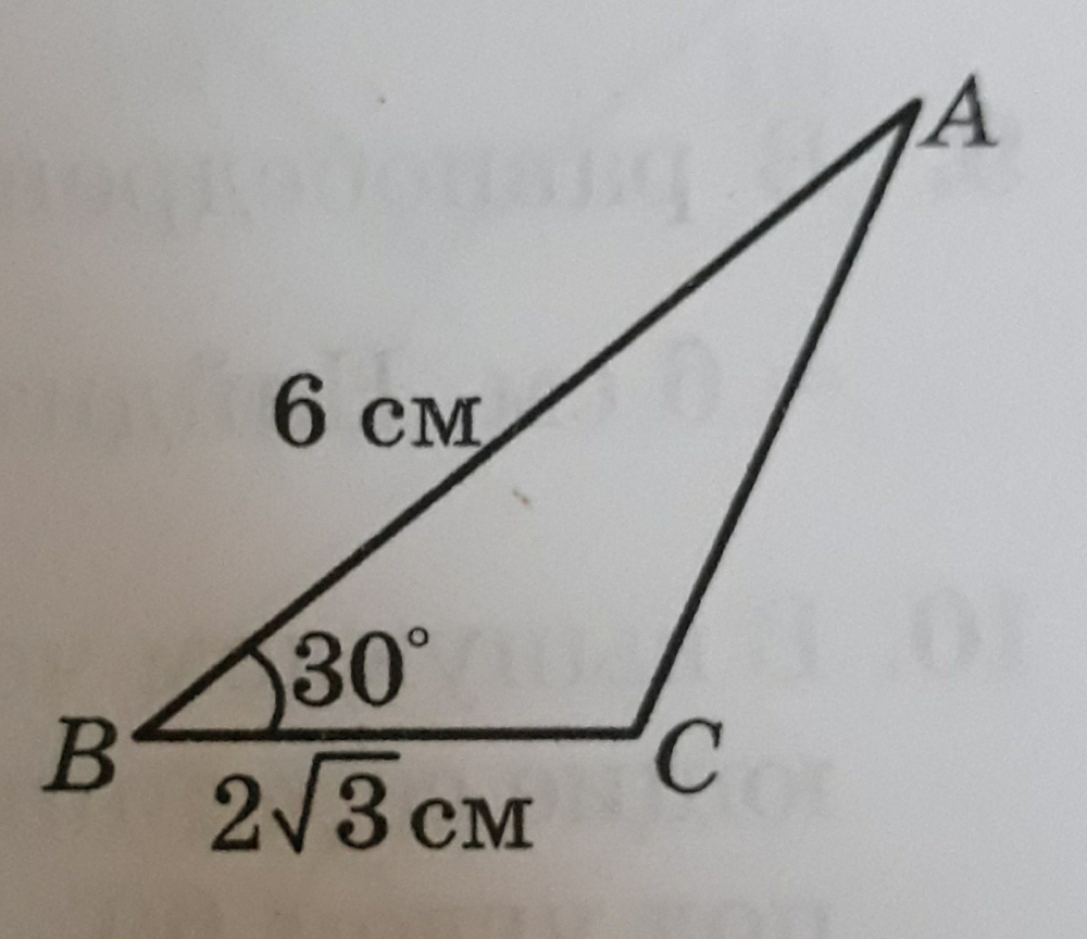 В треугольнике АВС стороны АВ=6см, ВС=\(2\sqrt{3}\), угол В равен 300. Найдите АС.