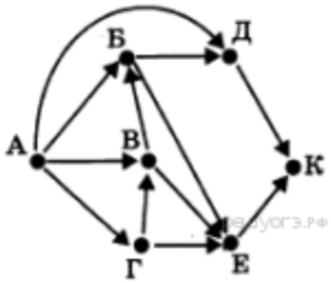 На рисунке — схема дорог, связывающих города А, Б, В, Г, Д, Е, К. По каждой дороге можно двигаться только в одном направлении, указанном стрелкой. Сколько существует различных путей из города А в город К?