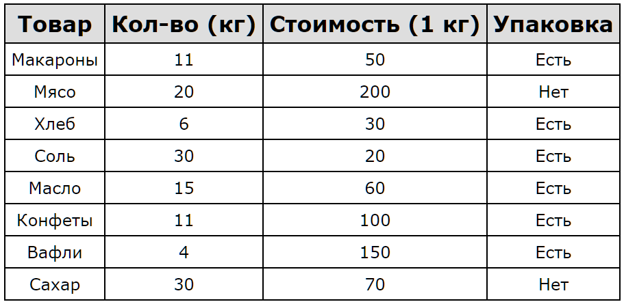 (Стоимость(1 кг) > 60) И (Упаковка = «Есть»)?