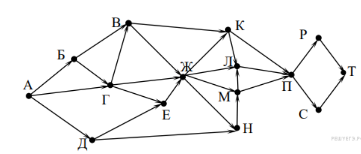 На рисунке — схема дорог, связывающих города А, Б, В, Г, Д, Е, Ж, К, Л, М, Н, П, Р, С, Т. По каждой дороге можно двигаться только в одном направлении, указанном стрелкой.