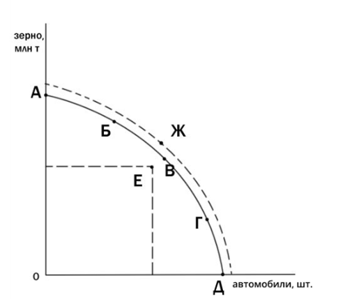 - В рамках кривой производственных возможностей можно одновременно увеличить производство и зерна, и автомобилей.