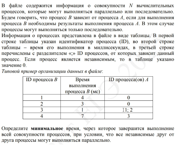 В файле содержится информация о совокупности N вычислительных процессов, которые могут выполняться параллельно или последовательно. Будем говорить, что процесс B зависит от процесса A, если для выполнения процесса B необходимы результаты выполнения процесса A. В этом случае процессы могут выполняться только последовательно. Информация о процессах представлена в файле в виде таблицы. В первом столбце таблицы указан идентификатор процесса (ID), во втором столбце таблицы – время его выполнения в миллисекундах, в третьем столбце перечислены с разделителем «;» ID процессов, от которых зависит данный процесс. Если процесс является независимым, то в таблице указано значение 0.