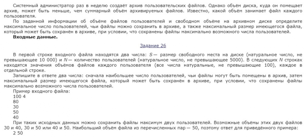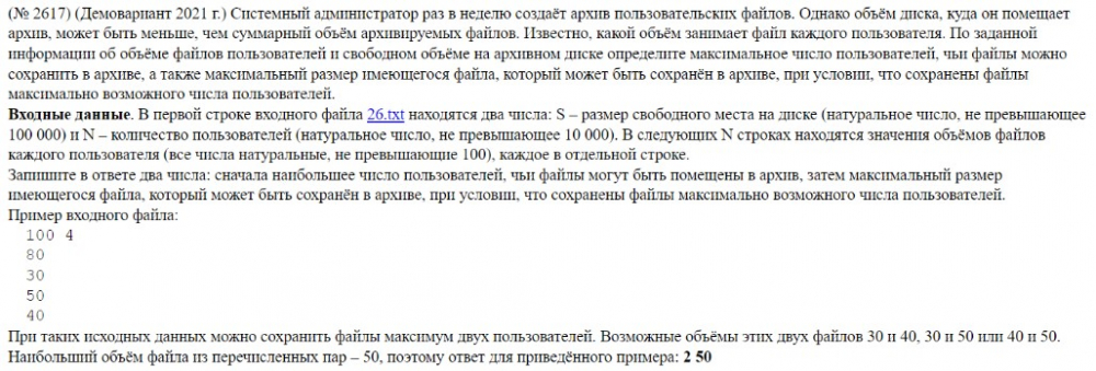 Входные данные. Первая строка входного файла 26-39.txt записаны два числа: два целых числа: N – общее количество грузов и M – грузоподъёмность грузовика в кг. Каждая из следующих N строк содержит одно целое число – массу груза в кг. В ответе запишите два целых числа: сначала максимально возможное количество грузов, затем их общую массу.