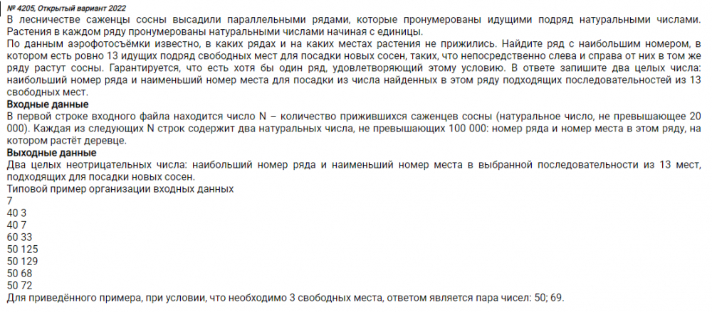 Входные данные представлены в файле 26-79.txt следующим образом. . В первой строке записаны два числа: N – количество занятых мест (натуральное число, не превышающее 10 000) и K – длина цепочки неприжившихся саженцев, которую нужно найти. Каждая из следующих N строк содержит сведения об одном прижившемся саженце – два натуральных числа, не превышающих 100 000: номер ряда и номер саженца в ряду.