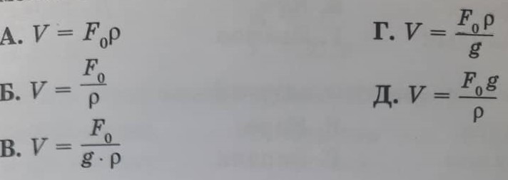 1.5. Металл шарчага Fo оордук күчү аракет этет. Металлдын тыгыздыгы р. Шарчанын көлөмү кайсы формула менен аныкталат?