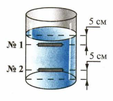 Пластинка №1 находится на глубине 5 см от поверхности воды, а пластинка №2 на расстоянии 5 см от дна сосуда. На какую из них давление воды больше?