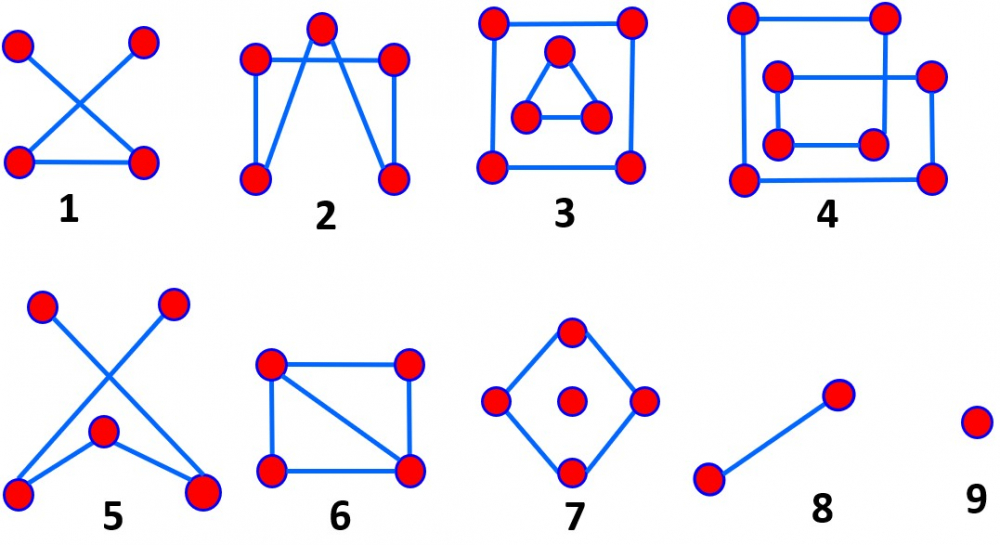 Рассмотрите графы на рисунке. Перечислите номера рисунков на которых изображен связный граф. В ответе запишите номера рисунков в порядке возрастания одним числом.