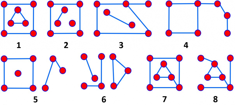 Рассмотрите граф на рисунке. Перечислите номера рисунков на которых изображен граф-цепь. В ответе запишите номера рисунков в порядке возрастания одним числом.