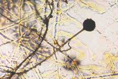 Рассмотрите микрофотографию плесневого гриба-мукора. Что содержится в черных шариках у этого гриба?
