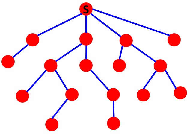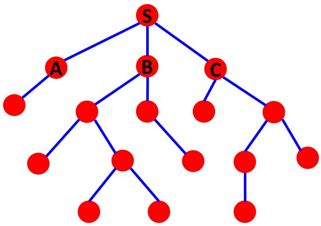 На рисунке изображено дерево. Рассмотрим цепи соединяющие начальную вершину S с концевыми. Сколько таких цепей имеют длину 3?