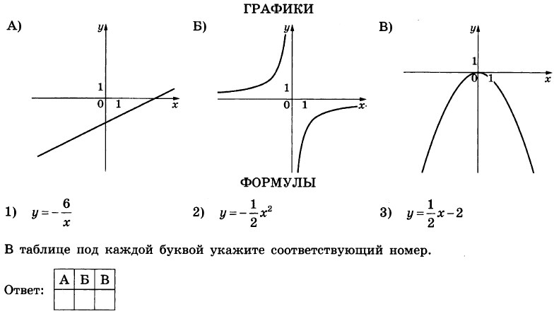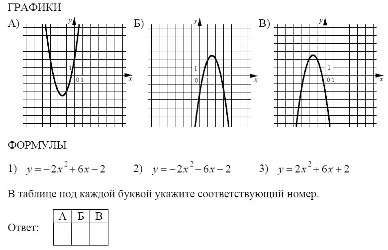 Установите соответствие между формулами и графиками. В ответ запишите числа без пробелов и запятых (например, 123)