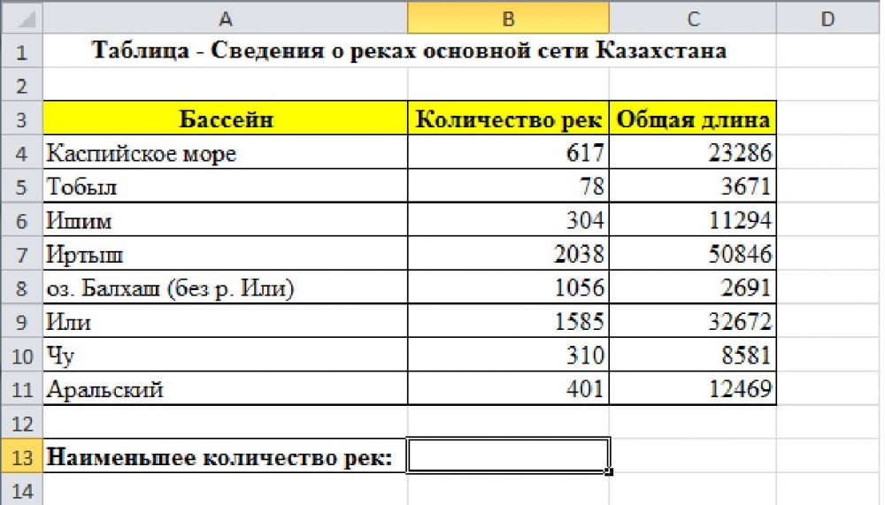Дана таблица, которая содержит сведения о речных системах Казахстана. Напишите функцию для нахождения бассейна с наименьшим количеством рек.