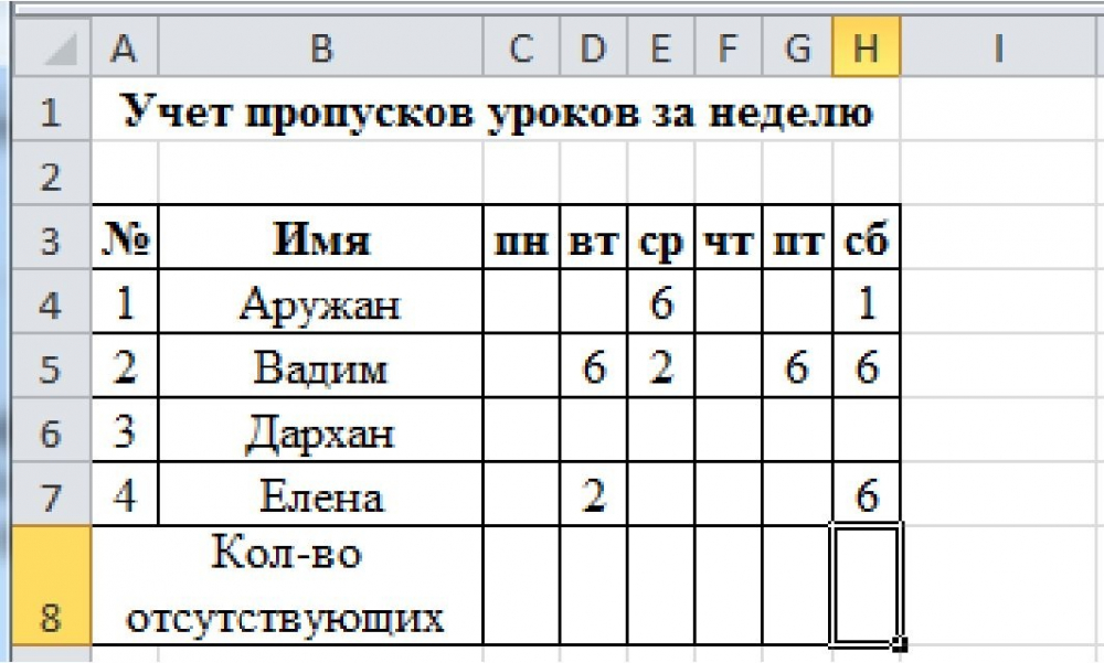 Напишите в ячейке H8 функцию для расчета количества отсутствующих учеников за субботу, если отсутствующим считается ученик, пропустивший не менее 6 уроков.