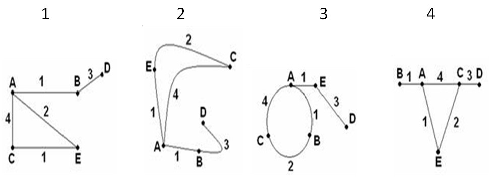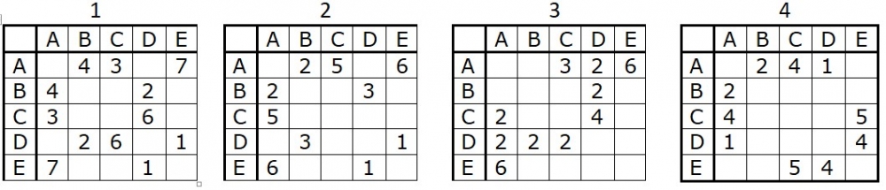 В таблице приведена стоимость перевозок между соседними железнодорожными станциями. Укажите номер схемы, соответствующую таблице.