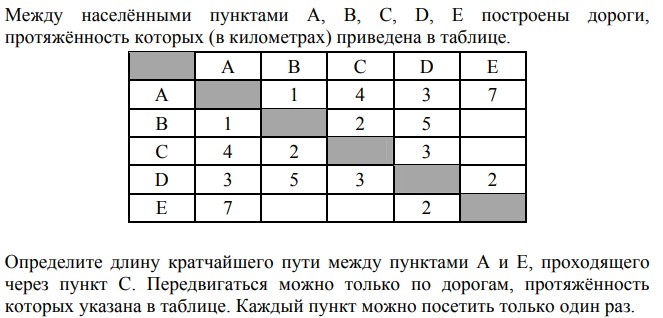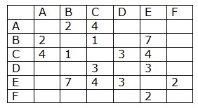 Между населёнными пунктами A, B, C, D, E, F построены дороги, протяжённость которых приведена в таблице. (Отсутствие числа в таблице означает, что прямой дороги между пунктами нет.)