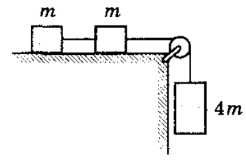 Три груза массами m, m, 4m соответственно, связаны нерастяжимыми и невесомыми нитями. Блок невесом и трения в оси блока отсутствует.