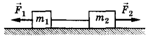 На горизонтальной поверхности лежат два груза соеденные легкой нерастяжимой нитью. На правый груз действует сила \(F_{_2}\), а на левый \(F_{_1}\). Выберите все верные утверждения. Трение отсутствует. Масса правого груза в два раза больше массы второго.