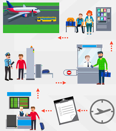 Put the instructions on how to act at the airport in the correct order.