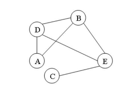 На схеме отражено наличие дорог между пятью городами: A, B, C, D и E. Укажите таблицу, соответствующую схеме (единица на пересечении строки и столбца указывает на наличие дороги между городами).
