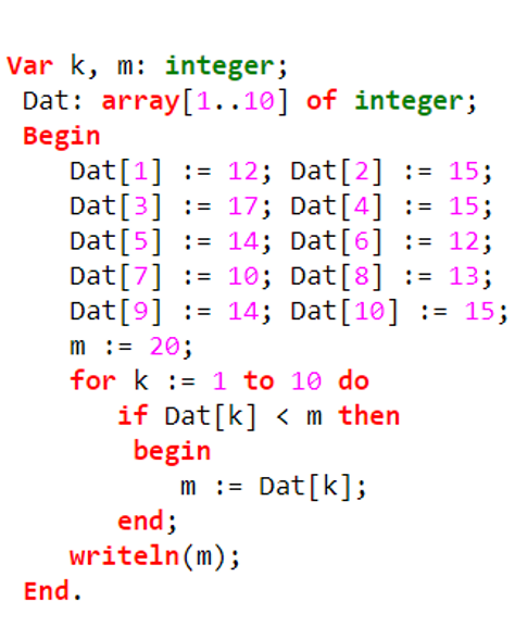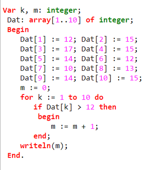 В таблице Dat хранятся данные измерений среднесуточной температуры за 10 дней в градусах (Dat[1] — данные за первый день, Dat[2] — за второй и т. д.). Определите, какое число будет напечатано в результате работы следующей программы.