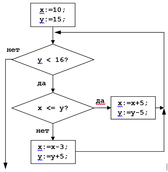 Сколько раз выполнится команда z=x*y в следующей блок-схеме?