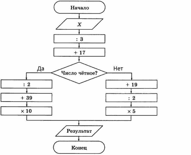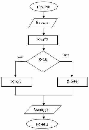 Вычислите алгоритм разветвленной структуры, представленной в виде блок-схемы, если а=5
