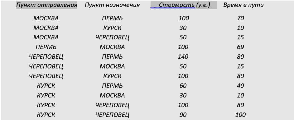 Транспортная фирма осуществляет грузоперевозки разными видами транспорта между четырьмя городами: ЧЕРЕПОВЕЦ, МОСКВА, КУРСК, ПЕРМЬ. Стоимость доставки грузов и время в пути указаны в таблице.