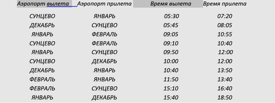 Между четырьмя местными аэропортами: СУНЦЕВО, ДЕКАБРЬ, ЯНВАРЬ и ФЕВРАЛЬ, ежедневно выполняются авиарейсы. Приведён фрагмент расписания перелётов между ними.