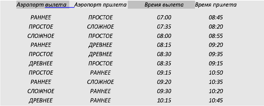 Между четырьмя местными аэропортами: ПРОСТОЕ, СЛОЖНОЕ, ДРЕВНЕЕ и РАННЕЕ, ежедневно выполняются авиарейсы. Приведён фрагмент расписания перелётов между ними.