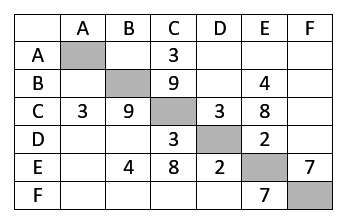 Между населёнными пунктами A, B, C, D, E, F построены дороги, протяжённость которых приведена в таблице. (Отсутствие числа в таблице означает, что прямой дороги между пунктами нет).