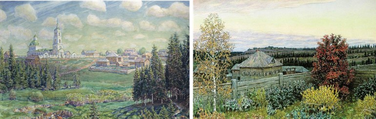 Какой населённый пункт изображён на этих рисунках Аполлинария Васнецова? В ответе укажите слово в начальной форме. Например, Иваново