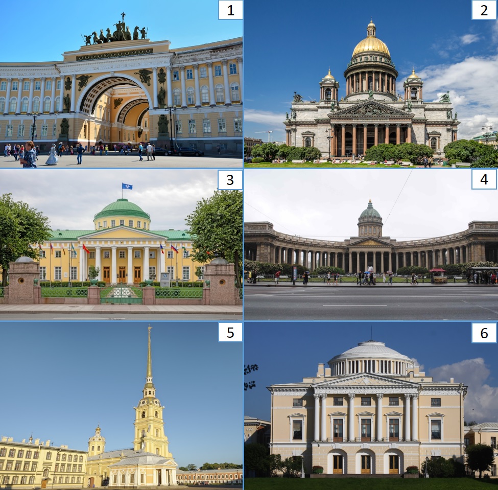 Выберите те фрагменты изображений, которые относятся к зданию Адмиралтейства архитектора А.А.Захарова. (7 вариантов из 10)