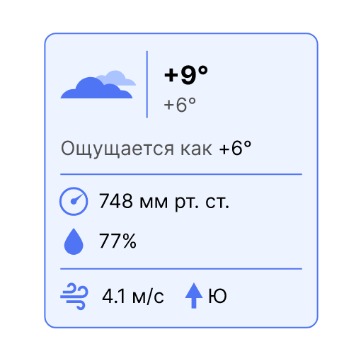 - Завтра день ожидается пасмурный, температура воздуха — плюс 9 градусов Цельсия, ночью плюс 6 градусов, а по ощущениям днём будет не более 66 градусов. Давление составит 748 мм ртутного столба, относительная влажность — 77 процентов. Будет дуть южный ветер со скоростью 4,1 метра в секунду.