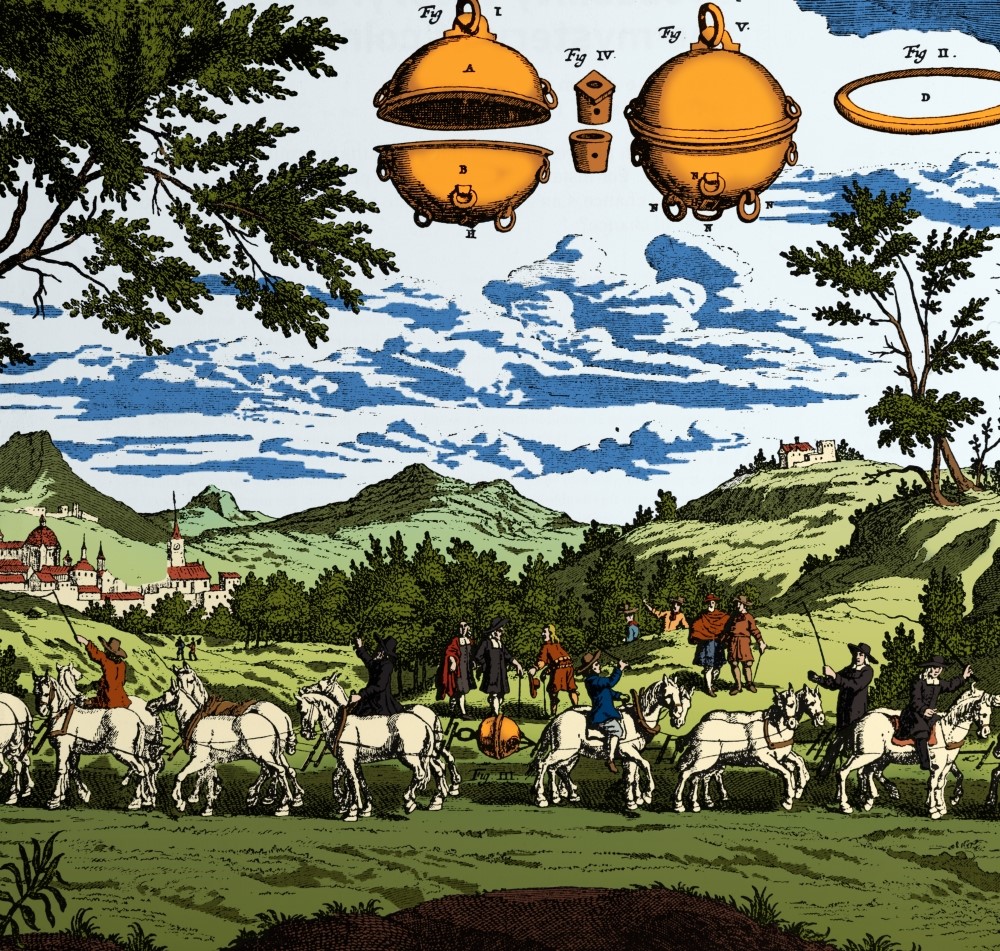 Опыт Отто Герике показал 8 мая 1654 г. в г. Магдебурге. Он сам описывает этот опыт следующим образом: «Я заказал два медных полушария приблизительно в 3/4 магдебургских локтя в диаметре, или точнее, — так как мастера не очень-то заботятся о строгом соблюдении заказанных размеров, — в 67 сотых локтя. Обе половины были совершенно одинаковы. Одна половина была снабжена краном или, скорее, клапаном, посредством которого мог извлекаться внутренний воздух из шара и впускаться наружный в шар. Кроме того, на обоих полушариях были железные кольца с пропущенными через них веревками для впрягания лошадей. Затем я заказал кожаное кольцо, пропитанное раствором воска в терпентине, чтобы оно не пропускало воздуха. Это кольцо было положено между полушариями, и из них быстро был выкачан воздух. При этом полушария оказались прижатыми к кожаному кольцу настолько сильно, что шестнадцать лошадей либо вовсе не могли разорвать их, либо разрывали с великим трудом. Когда разрыв происходил, то слышался звук вроде ружейного выстрела. Когда в пустоту полушарий вводился воздух, то равнять их было очень легко. Так как полушария после разрыва всегда несколько портились, особенно если они падали на землю, причем нарушалась их правильная кругообразная форма, то я заказал полушария большего размера, именно в 1 локоть диаметром. Но и тут медники не выполнили с точностью заказа: диаметр составлял лишь 95/100 локтя. Эти полушария после откачки воздуха уже не разрывались 24 лошадьми; а когда в них был впущен воздух, они разнимались очень легко».