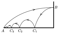 Мяч бросили в точке А и он горизонтально ударился о стену в точке В. Из B мяч "летит" в точки C1,C2,... и, наконец, возвращается в точку A. Коэффициент восстановления равен ε в любой точке. Найдите ε, если мяч, возвращаясь в точку A, вообще не отскакивает вверх.