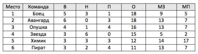 Сколько записей в нижеследующем фрагменте турнирной таблицы удовлетворяют условию: